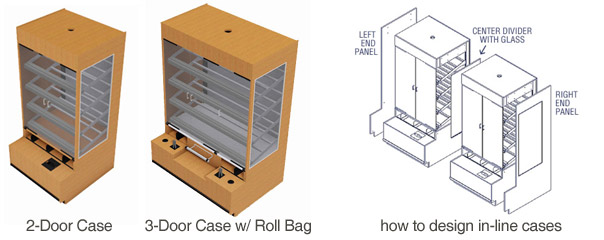 Standard (height and depth) sizing provides complete flexibility so that you can create as large a display as necessary. Order an in-line run of several cases to fit side-by-side (see the example illustration above). Cases come standard without end panels so you can effectively order as many as necessary — and then simply add an optional end panel to the two end cases in your display. You can also add optional divider panels to separate bakery items between the cases.